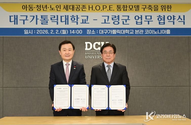 코리아타임뉴스 경북취재본부 | 고령군은 2월 2일 대구가톨릭대학교와 함께 경상북도 지역혁신중심 대학지원체계(RISE)사업의 일환으로'경북 U-Care 맞춤돌봄서비스'추진을 위한 업무협약을 체결했다고 밝혔다.