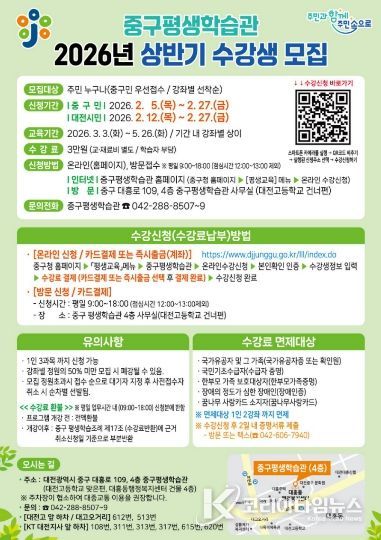 코리아타임뉴스 대전취재본부 | 대전 중구는 2월 5일부터 2026년 상반기 중구 평생 학습관 프로그램 수강생을 선착순 모집한다고 밝혔다.