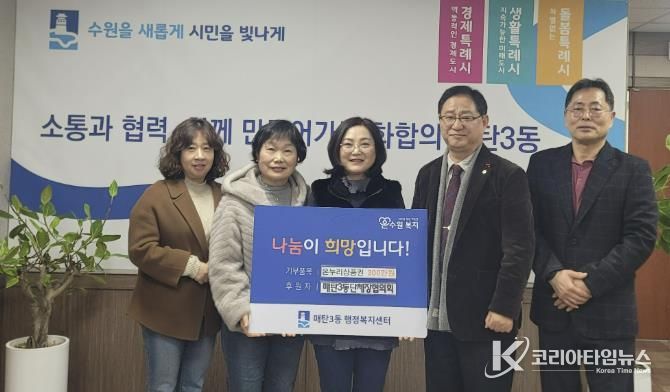 코리아타임뉴스 사회팀 | 수원시 영통구 매탄3동은 지난 3일 매탄3동 단체장협의회가 다가오는 설 명절을 맞아 관내 어려운 이웃들을 위해 누리상품권 300장(총 300만원 상당)을 기부했다고 밝혔다.