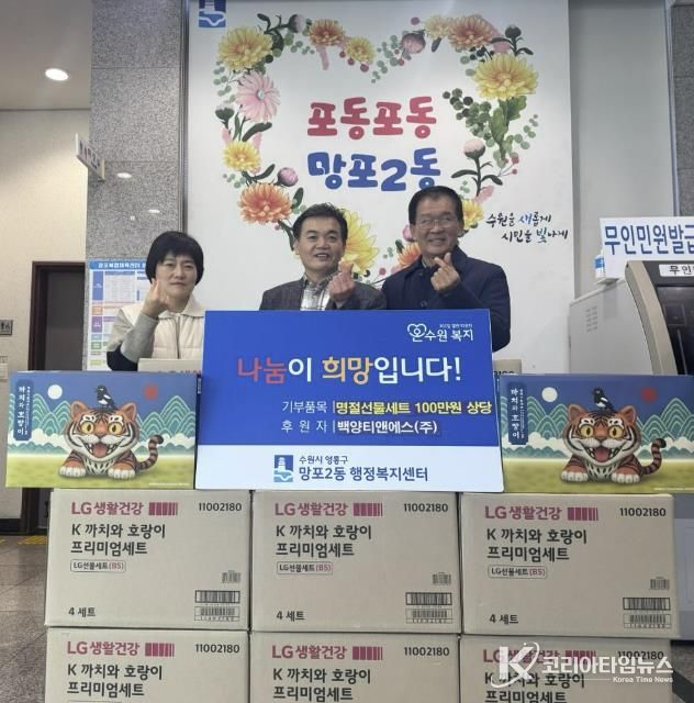 코리아타임뉴스 사회팀 | 영통구 망포2동 행정복지센터는 지난 3일 백양티앤에스(주)가 설 명절을 맞아 100만 원 상당의 명절 선물세트를 망포2동 취약계층을 위해 기탁했다고 밝혔다.