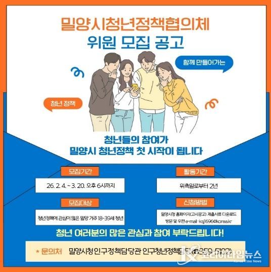 코리아타임뉴스 경남취재본부 | 경남 밀양시는 오는 3월 20일까지 시정의 주역으로서 청년 문제를 논의하고 정책을 직접 발굴·제안할 청년정책협의체 구성원을 모집한다.