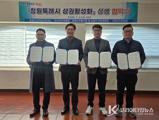 코리아타임뉴스 경남취재본부 | 창원시상권활성화재단(이사장 장금용)은 2월 4일 오후 2시, 창원시상권활성화재단 어울림센터에서 마산통합상인연합회, 창원시 전통시장 및 상점가 상인연합회, 진해상인연합회(대표시장: 진해중앙시장)와 '창원특례시 상권활성화'를 위한 상생 업무협약을 체결했다.
