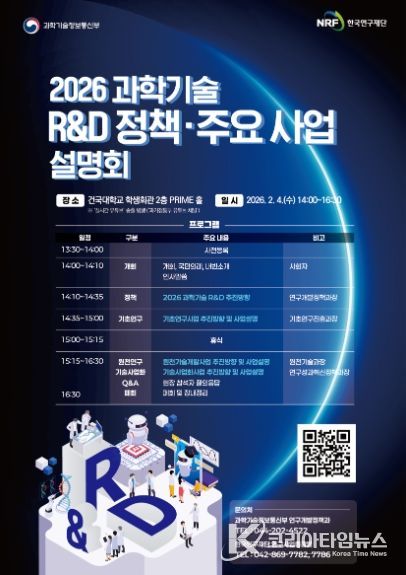 코리아타임뉴스 오영주 기자 | 과학기술정보통신부는 2월 4일 오후 2시 건국대학교 학생회관 2층 PRIME홀에서 ‘2026 과학 기술 연구개발(R&D) 정책·주요 사업 설명회’를 개최했다고 밝혔다.