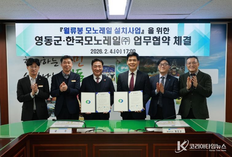 영동군은 4일 오후 군청 상황실에서 한국모노레일㈜과 월류봉 모노레일 설치를 위한 업무협약(MOU)을 체결하고, 민·관 협력을 바탕으로 관광 인프라를 확충해 체류형 관광 활성화에 나선다고 밝혔다.