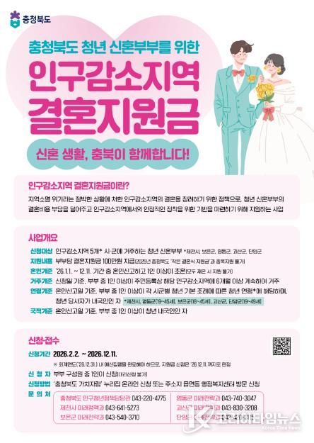 코리아타임뉴스 박찬식 기자 | 충북 괴산군은 청년들의 결혼 초기 경제적 부담을 덜고 안정적인 지역 정착을 돕기 위해 ‘2026년 인구감소지역 결혼지원금 사업’을 본격 추진한다고 5일 밝혔다.