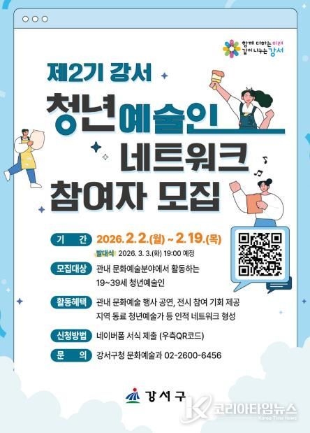 코리아타임뉴스 윤광희 기자 | 서울 강서구(구청장 진교훈)는 청년 예술인들의 창작 활동을 지원하기 위해 ‘제2기 강서 청년예술인 네트워크’ 참여자 모집에 나선다.