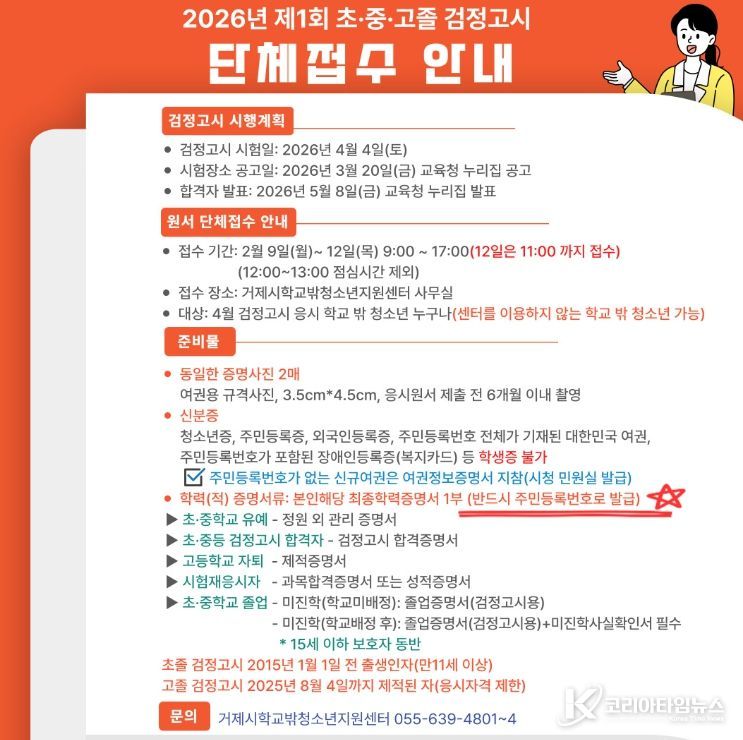 코리아타임뉴스 경남취재본부 | 거제시학교밖청소년지원센터는'2026년 제1회 초・중・고 졸업학력 검정고시'응시자를 위해 2월 9일 09:00부터 12일 17:00까지 학교 밖 청소년을 대상으로 단체 원서 접수를 지원한다고 밝혔다.
