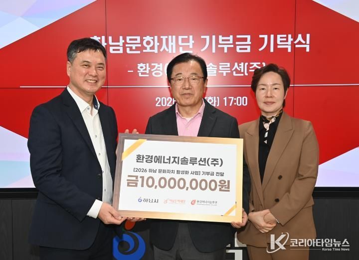 코리아타임뉴스 기동취재팀 | (재)하남문화재단은 2월 4일, 하남시청에서 환경에너지솔루션㈜으로부터 문화자치 활성화를 위한 기부금 1천만 원을 전달받았다고 밝혔다. 이날 기부식에는 이현재 하남시장을 비롯해 기업 및 재단 관계자들이 참석해 지역 상생과 ESG 실천의 의미를 공유했다.