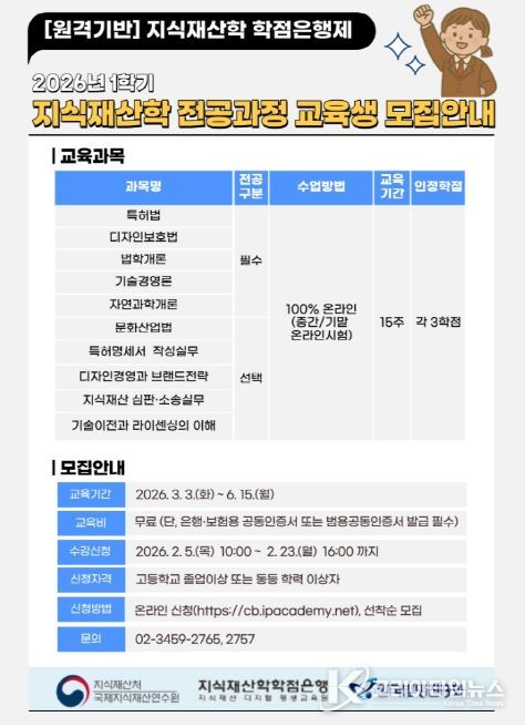 코리아타임뉴스 사회팀 | 지식재산처 국제지식재산연수원은 한국발명진흥회와 공동으로 2월 5일부터 23일까지 지식재산학 학점은행 과정에 대한 온라인 수강생을 모집한다.