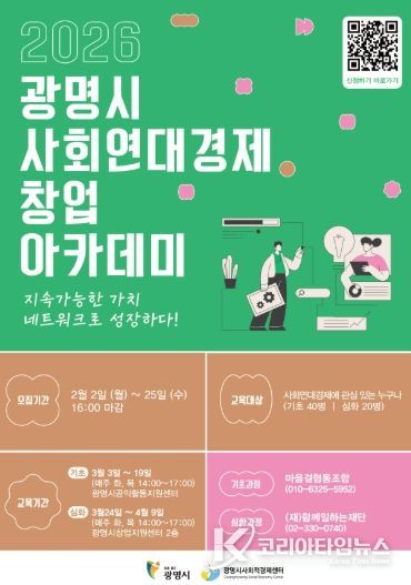 코리아타임뉴스 경기취재본부 | 광명시가 ‘2026년 광명시 사회연대경제 창업 아카데미’ 수강생을 오는 25일까지 모집한다.