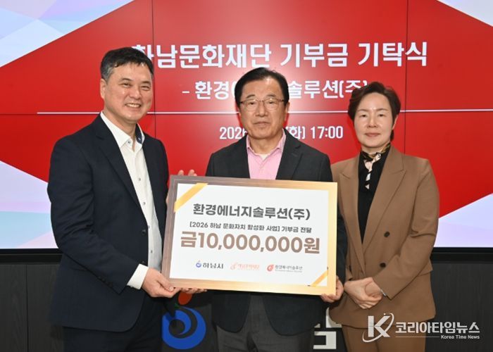 코리아타임뉴스 문화팀 | (재)하남문화재단은 2월 4일, 하남시청에서 환경에너지솔루션㈜으로부터 문화자치 활성화를 위한 기부금 1천만 원을 전달받았다고 밝혔다. 이날 기부식에는 이현재 하남시장을 비롯해 기업 및 재단 관계자들이 참석해 지역 상생과 ESG 실천의 의미를 공유했다.