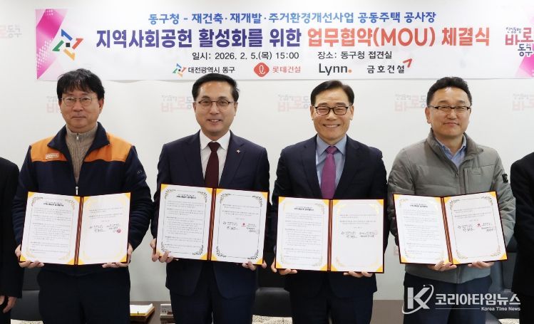 코리아타임뉴스 대전취재본부 | 대전 동구는 5일 관내 대규모 공동주택 공사 현장의 시공사와 ‘지역사회 공헌 활성화 업무협약’을 체결하고, 지역 안전관리 강화와 상생 협력을 위한 협력 체계를 구축했다고 밝혔다.
