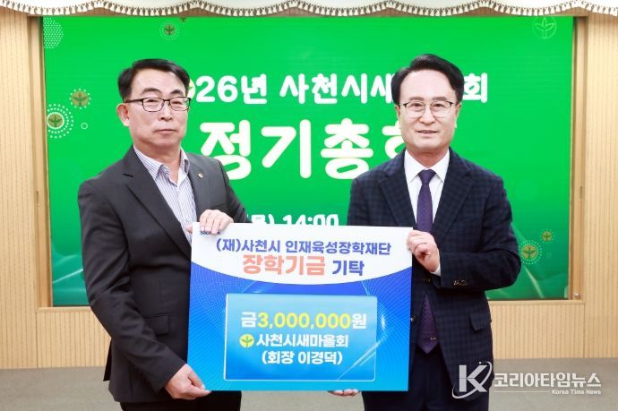 코리아타임뉴스 경남취재본부 | 사천시새마을회(회장 이경덕)는 5일 지역사회의 미래를 이끌어갈 인재 양성을 위해 사용해 달라며 사천시 인재육성장학재단(이사장 박동식)에 장학금 300만 원을 기탁했다.