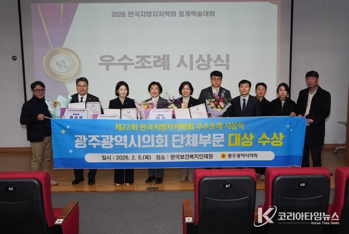 코리아타임뉴스 노승선 기자 | 광주광역시의회는 5일 청주시 한국보건복지인재원에서 열린 제22회 한국지방자치학회 주관 우수조례 시상식에서 단체 부문 대상을 비롯해 개인·공무원 부문에서도 우수상 등을 수상했다.