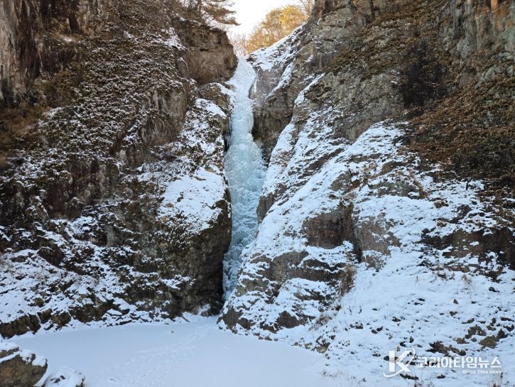 코리아타임뉴스 박찬식 기자 | 2월의 한겨울, 충북 영동군 심천면에 위치한 옥계폭포가 빙벽과 어우러진 웅장한 겨울 풍경으로 방문객들의 시선을 사로잡고 있다.