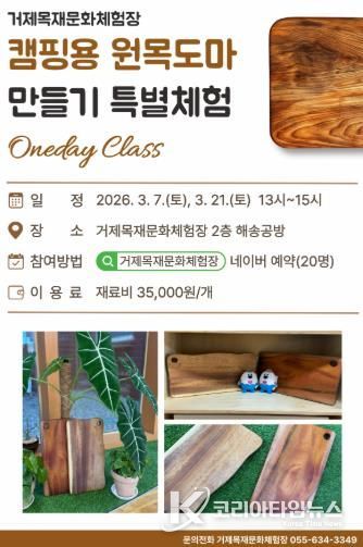 코리아타임뉴스 경남취재본부 | 거제목재문화체험장은 오는 3월 7일과 3월 21일, 성인 방문객을 대상으로 한 원데이클래스 프로그램 『캠핑용 원목도마 만들기 특별체험』을 운영한다고 밝혔다.