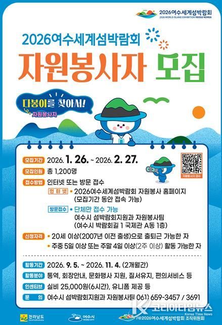 코리아타임뉴스 전남취재본부 | 여수시는 2026여수세계섬박람회 성공적인 개최를 위해 자원봉사자 다봉이(“다함께 봉사합니다”)를 모집 중이며 시민 참여 확대를 위해 “찾아가는 자원봉사 모집 설명회”를 운영할 계획이다.