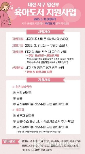 코리아타임뉴스 대전취재본부 | 대전 서구 공공도서관은 3월 31일부터 ‘임신부 육아 도서 지원사업’을 운영한다.