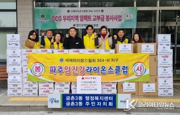 코리아타임뉴스 윤광희 기자 | 파주시 금촌3동은 국제라이온스협회 354-에이치(H) 지구 소속인 파주임진강라이온스클럽이 2026년 설 명절을 앞두고 지난 4일 금촌3동 행정복지센터를 방문해 지역 내 저소득층 가정을 돕기 위해 총 180만 원 상당의 생필품을 기탁했다고 밝혔다.