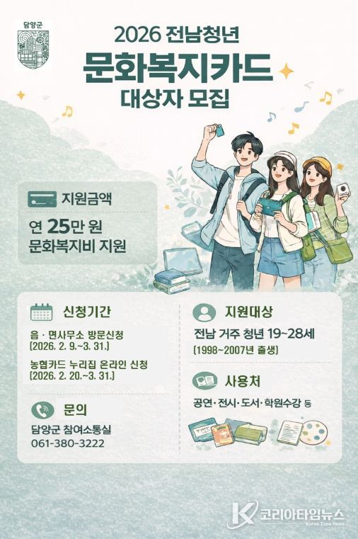 코리아타임뉴스 김태훈 기자 | 담양군은 관내 청년을 대상으로 문화생활 향유 및 자기 계발 기회를 제공하고자 전남청년 문화복지카드 지원사업을 추진한다고 9일 밝혔다.