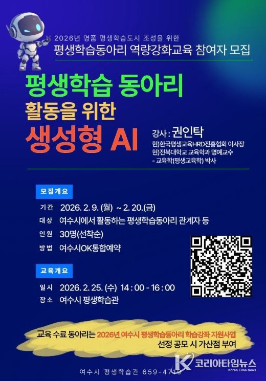 코리아타임뉴스 전남취재본부 | 여수시가 평생학습동아리의 기획력과 운영 역량 강화를 위해 ‘평생학습동아리 활동을 위한 생성형 AI 역량강화교육’을 운영하고 참여자를 모집한다.