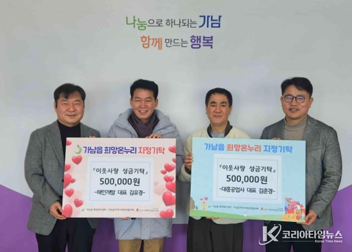 코리아타임뉴스 기동취재팀 | 여주시 가남읍 행정복지센터는 지난 9일, 해인개발과 대흥공업사에서 관내 어려운 이웃을 위한 성금 각 50만 원을 기탁하고, ‘가남읍 희망온누리’ 정기기부에 신규 참여했다고 밝혔다.