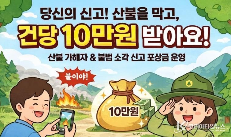 산림 또는 산림 인접 지역(100m 이내)에서 발생하는 논·밭두렁 태우기, 쓰레기 소각 등 불법 행위를 신고해 가해자 검거에 기여하거나 산불 확산을 방지한 경우, 건당 10만 원의 포상금을 지급한다.