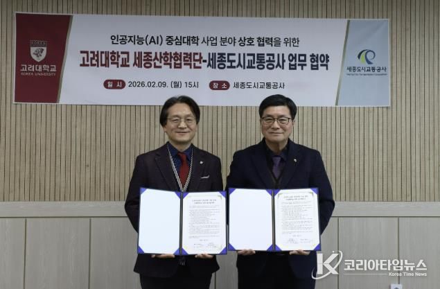 코리아타임뉴스 세종취재분부 | 세종도시교통공사는 2월 9일, 공사 사장실에서 고려대학교 세종산학협력단과 ‘인공지능(AI) 중심대학 사업 협력 및 공사 사업 AX(AI 전환) 가속화를 위한 업무협약(MOU)’을 체결했다고 밝혔다.