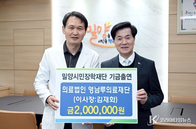 코리아타임뉴스 경남취재본부 | (재)밀양시민장학재단(이사장 안병구)은 10일 의료법인 영남루의료재단(이사장 김재화)과 대한숙박업중앙회 밀양시지부(지부장 조희선)에서 지역 교육 발전을 위한 장학기금으로 각각 200만원과 300만원을 기탁했다고 밝혔다.