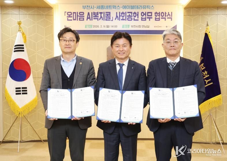 코리아타임뉴스 경기취재본부 | 부천시는 지난 9일 시청 만남실에서 세종네트웍스와 에이블테라퓨틱스와 함께 ‘온마음 AI복지콜’ 사회공헌 업무 협약을 체결했다.