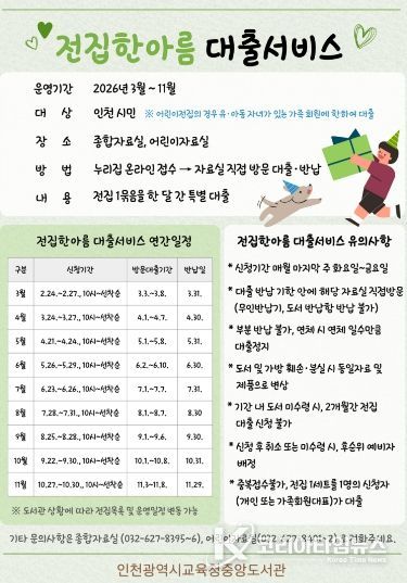코리아타임뉴스 사회팀 | 인천광역시교육청중앙도서관은 지역주민에게 다양한 독서 기회를 제공하기 위하여, 3월부터 11월까지 ‘전집한아름 대출서비스’를 운영한다.