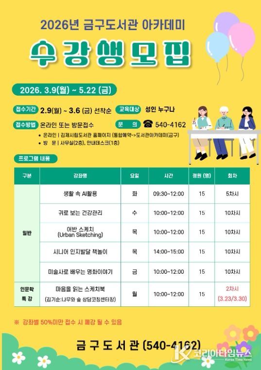 코리아타임뉴스 전북취재본부 | 김제시 금구도서관은 지역 주민들의 자기 계발과 문화 향유 기회를 확대하기 위해 2026년 금구도서관 아카데미 수강생을 오는 3월 6일까지 선착순 모집한다고 밝혔다.