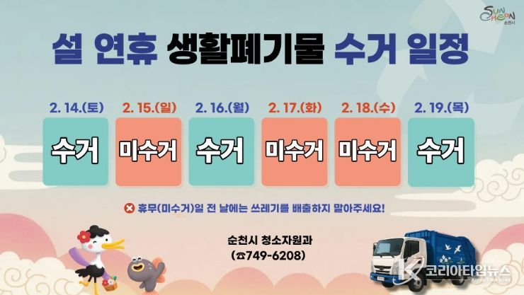 코리아타임뉴스 전남취재본부 | 순천시는 설 연휴 기간 생활폐기물로 인한 시민 불편을 최소화하고 쾌적한 도시환경을 조성하기 위해 생활폐기물 수집·운반체계를 안정적으로 운영한다고 밝혔다.
