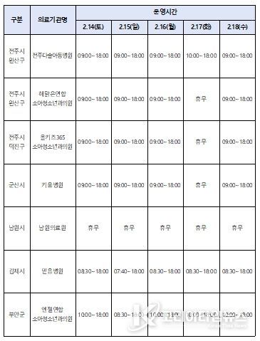 권역응급의료센터 등 주요 응급의료기관의 과부하를 줄이고 경증 환자의 외래 진료 공백을 최소화하기 위해, 연휴 기간 하루 평균 의료기관 459개소와 약국 240개소가 운영된다. 특히 소아 응급환자 진료 공백을 최소화하기 위해 예수병원 소아전문응급의료센터는 24시간 운영되며, 달빛어린이병원과 원광대학교병원 권역응급의료센터 소아진료실도 정상 운영된다.