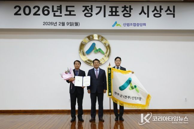 코리아타임뉴스 전북취재본부 | 완주군(전주)산림조합(조합장 임필환)은 지난9일 서울 송파구 산림조합중앙회 청사에서 열린 ‘2026년 정기표창 시상식’에서 전국 산림조합 경영종합평가 분야 3위에 선정돼 수상의 영예를 안았다.