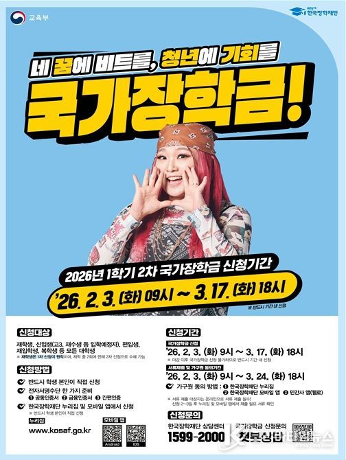 한편, 국가장학금을 지원받기 위해서는 반드시 신청 기간 내 국가장학금을 신청해야 한다. 현재 2026년 1학기 국가장학금 2차(최종) 통합 신청 기간이므로, 아직 신청하지 않은 학생은 신청 기간(2월 3일(화) ~3월 17일(화) 18시) 내 한국장학재단 누리집과 이동통신 앱(‘한국장학재단’)을 통해 신청해야 한다.