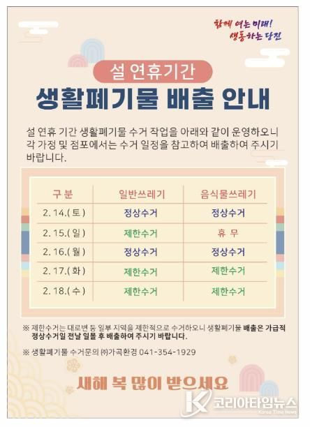 시에 따르면 설 연휴 기간인 2월 14일부터 2월 18일까지 일반쓰레기와 음식물쓰레기 수거가 일부 조정된다.