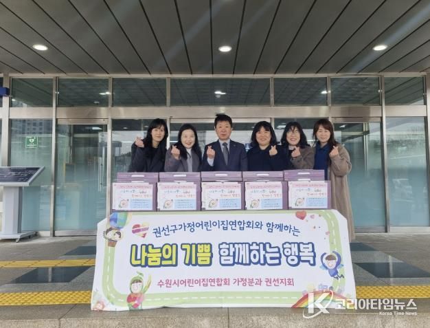 코리아타임뉴스 사회팀 | 수원시어린이집연합회 가정분과 권선지회에서는 지난 10일 권선구를 찾아 떡국떡 60박스를 후원했다.