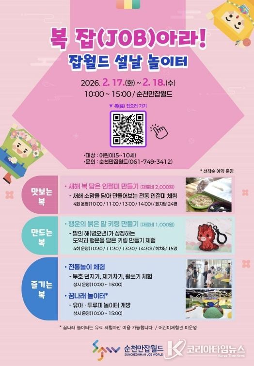 코리아타임뉴스 전남취재본부 | 순천시는 오는 17일부터 18일까지 설날 연휴를 맞아 순천만잡월드에서 ‘복 잡(JOB)아라! 잡월드 설날 놀이터’ 이벤트를 개최한다고 밝혔다.