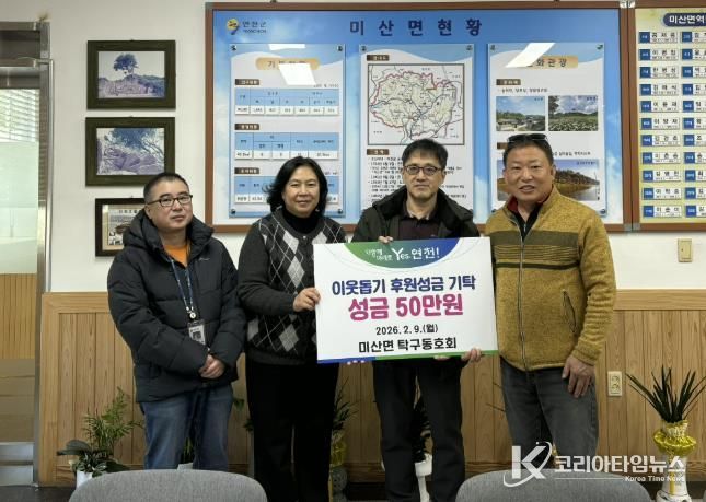 코리아타임뉴스 윤광희 기자 | 미산면 탁구동호회는 지난 9일 미산면 지역사회보장협의체에 이웃돕기 성금 50만원을 기탁했다.