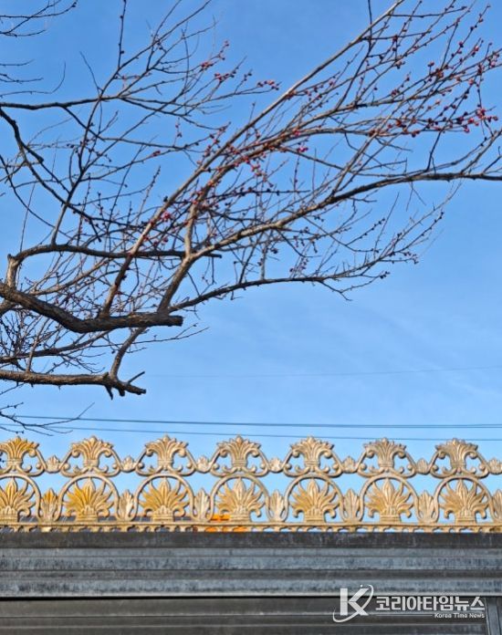 코리아타임뉴스 전남취재본부 | 순천시 조곡동, 홍매화가 관사마을의 봄을 환하게 밝혔다.