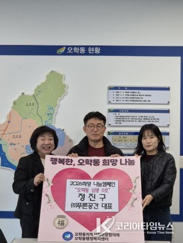 코리아타임뉴스 기동취재팀 | 여주시 오학동은 ㈜푸른공간 정진구 대표가 지난 10일 오학동 행정복지센터를 방문해 이웃돕기 성금 50만 원을 기탁했다고 밝혔다.