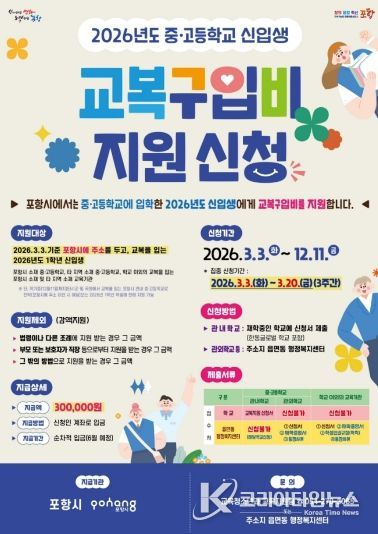 코리아타임뉴스 경북취재본부 | 포항시는 교육의 공공성 강화와 학부모 교육비 부담 완화를 위해 2026학년도 중·고등학교 신입생 교복 구입비 지원 신청을 내달 3일부터 접수한다.