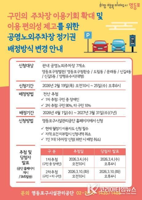 코리아타임뉴스 윤광희 기자 | 영등포구가 관내 공영노외주차장 7개소에 대한 정기권 신청을 ‘선착순 순환배정제’에서 ‘구민 우선 전산추첨 순환배정제’로 변경해 오는 19일부터 25일까지 접수한다고 밝혔다.