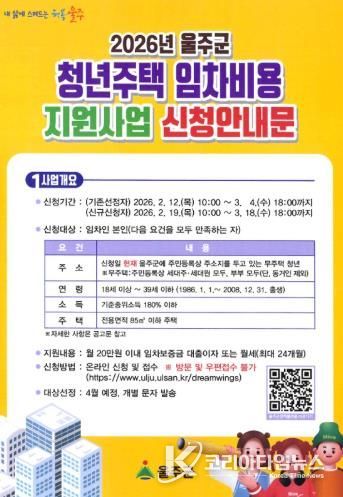 코리아타임뉴스 울산취재본부 | 울산 울주군이 청년의 주거비 부담을 완화하고 지역 정착을 지원하기 위해 ‘2026년 청년 주택 임차비용 지원사업’을 추진한다고 12일 밝혔다.