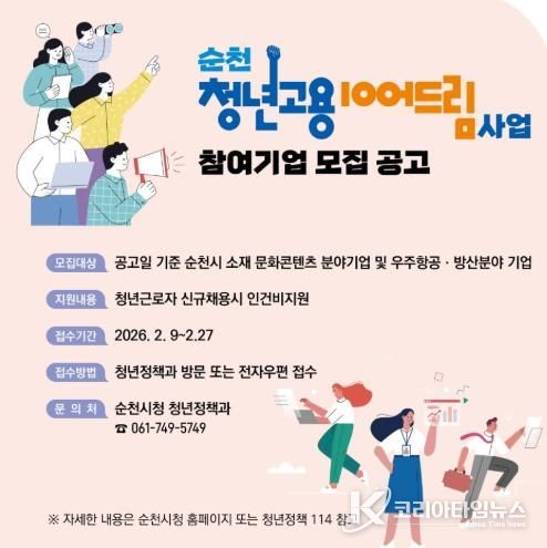 지원 인원은 총 85명으로 모집 기간은 2월 9일부터 27일까지이며, 자세한 사항은 순천시청 누리집 또는 청년정책114 홈페이지를 참고하거나 순천시청 청년정책과 청년일자리팀으로 문의하면 된다.
