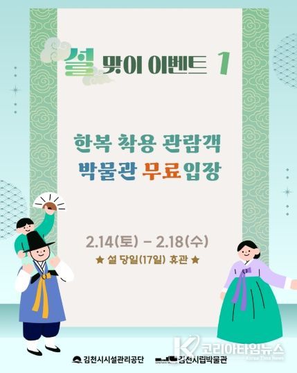 코리아타임뉴스 윤광희 기자 | 김천시시설관리공단(이사장 김재광)은 2026년 설 명절을 맞아 감문국이야기나라와 김천시립박물관을 중심으로 가족 단위 관람객이 함께 즐길 수 있는 ‘설맞이 문화 행사’를 운영한다. 이번 행사는 2월 14일부터 2월 18일까지 진행된다.