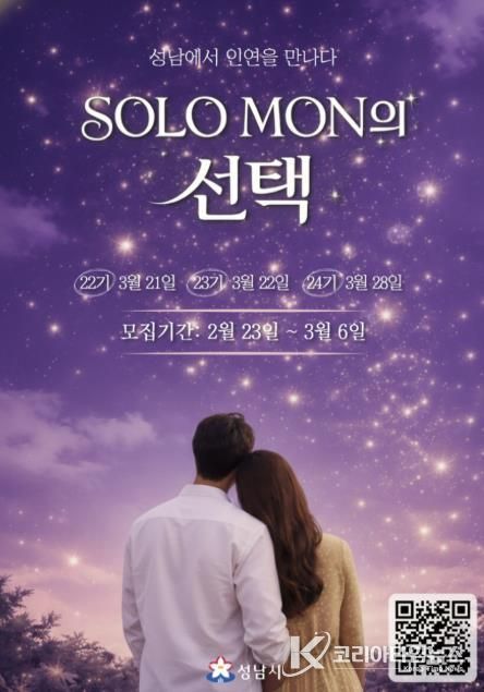 코리아타임뉴스 경기취재본부 | 성남시는 오는 2월 23일부터 3월 6일까지 ‘솔로몬(SOLO MON)의 선택’ 22~24기 행사 참가 희망자 300명(남녀 각 150명)을 모집한다.