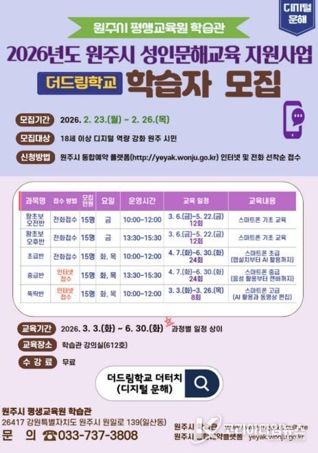 코리아타임뉴스 이아름 기자 | 원주시 평생교육원 학습관은 오는 23일부터 26일까지 더드림학교 더터치반(디지털 문해교육) 수강생을 모집한다.