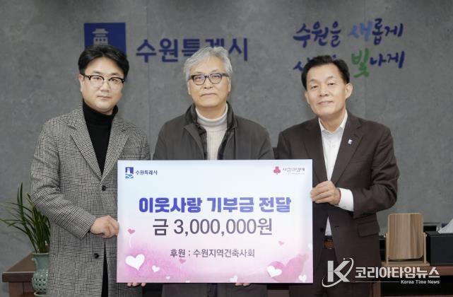 이웃돕기성금 300만 원은 수원지역건축사회 회원 137명이 모금해 마련했다. 수원지역건축사회는 2024년에도 이웃돕기성금 300만 원을 기부한 바 있다.